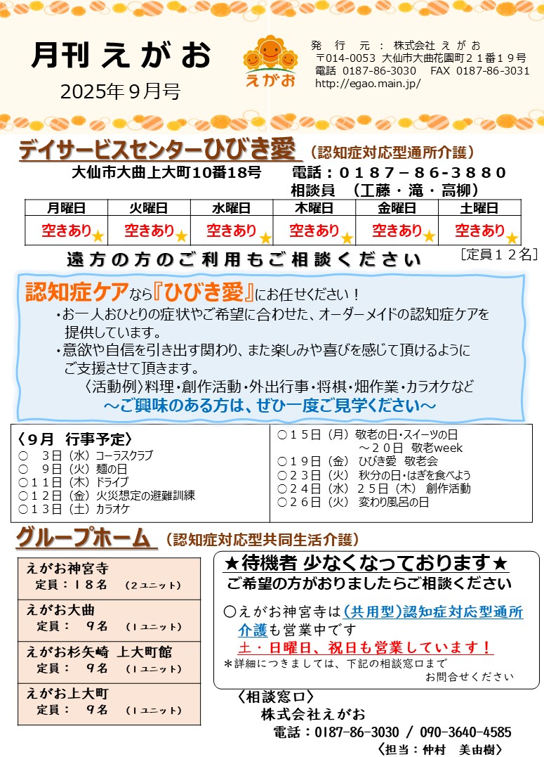 2025年9月10日 / 最終更新日時 : 2025年9月10日 egao-Administrator 月刊えがお 月刊えがお2025年9月 デイサービスセンターひびき愛の月間行事や利用可能人数などです ※クリックすると拡大できます コメントを残す コメントをキャンセルメールアドレスが公開されることはありません。 ※ が付いている欄は必須項目ですコメント ※ 名前 ※ メール ※ サイト 次回のコメントで使用するためブラウザーに自分の名前、メールアドレス、サイトを保存する。 新しいコメントをメールで通知 新しい投稿をメールで受け取る Δ このサイトはスパムを低減するために Akismet を使っています。コメントデータの処理方法の詳細はこちらをご覧ください。