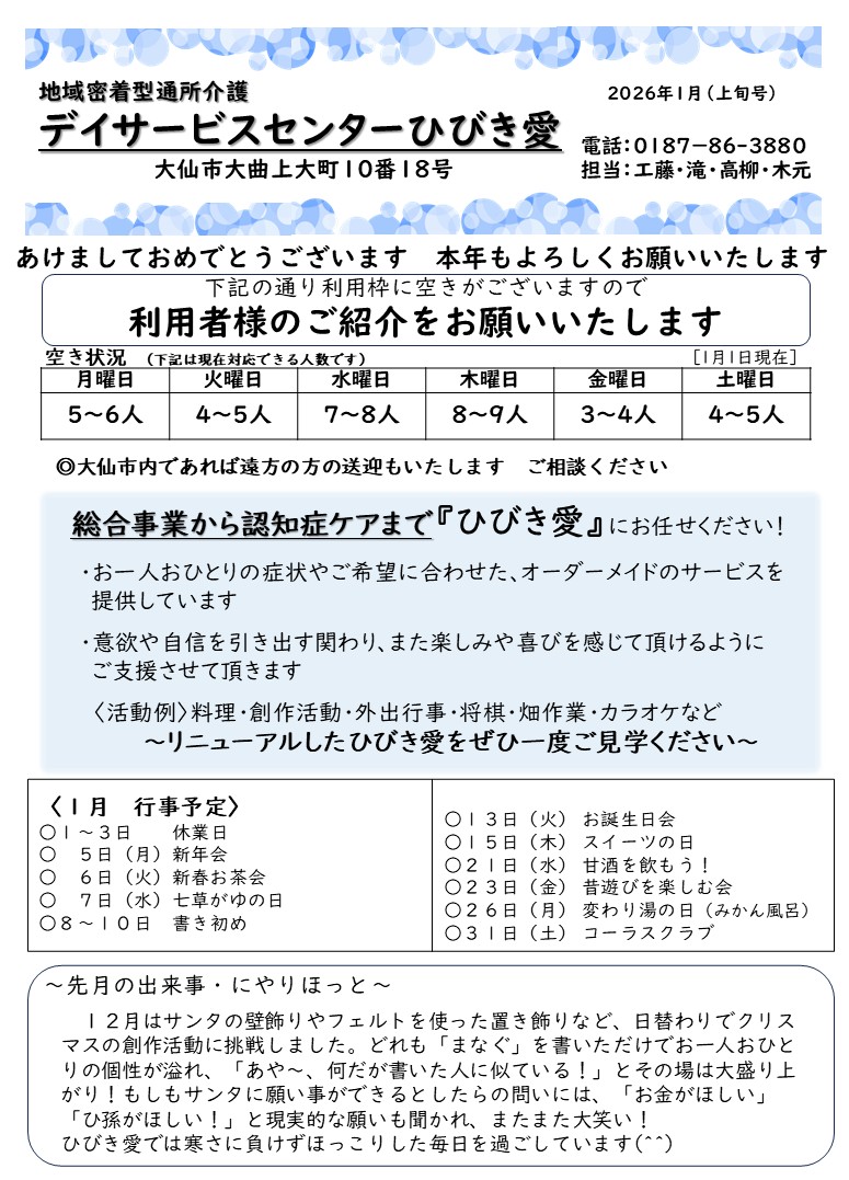 2026年1月5日 / 最終更新日時 : 2026年1月23日 egao-Administrator デイサービス空き情報 ひびき愛空き情報2026年1月上旬 デイサービスセンターひびき愛の月間行事や利用可能人数などです ※クリックすると拡大できます コメントを残す コメントをキャンセルメールアドレスが公開されることはありません。 ※ が付いている欄は必須項目ですコメント ※ 名前 ※ メール ※ サイト 次回のコメントで使用するためブラウザーに自分の名前、メールアドレス、サイトを保存する。 新しいコメントをメールで通知 新しい投稿をメールで受け取る Δ このサイトはスパムを低減するために Akismet を使っています。コメントデータの処理方法の詳細はこちらをご覧ください。