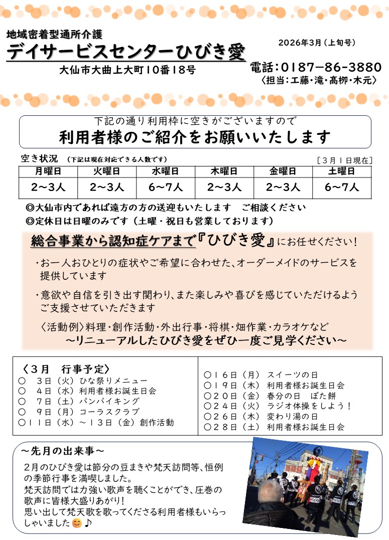 2026年3月4日 / 最終更新日時 : 2026年3月4日 egao-Administrator デイサービス空き情報 ひびき愛空き情報2026年3月上旬 デイサービスセンターひびき愛の月間行事や利用可能人数などです ※クリックすると拡大できます コメントを残す コメントをキャンセルメールアドレスが公開されることはありません。 ※ が付いている欄は必須項目ですコメント ※ 名前 ※ メール ※ サイト 次回のコメントで使用するためブラウザーに自分の名前、メールアドレス、サイトを保存する。 新しいコメントをメールで通知 新しい投稿をメールで受け取る Δ このサイトはスパムを低減するために Akismet を使っています。コメントデータの処理方法の詳細はこちらをご覧ください。